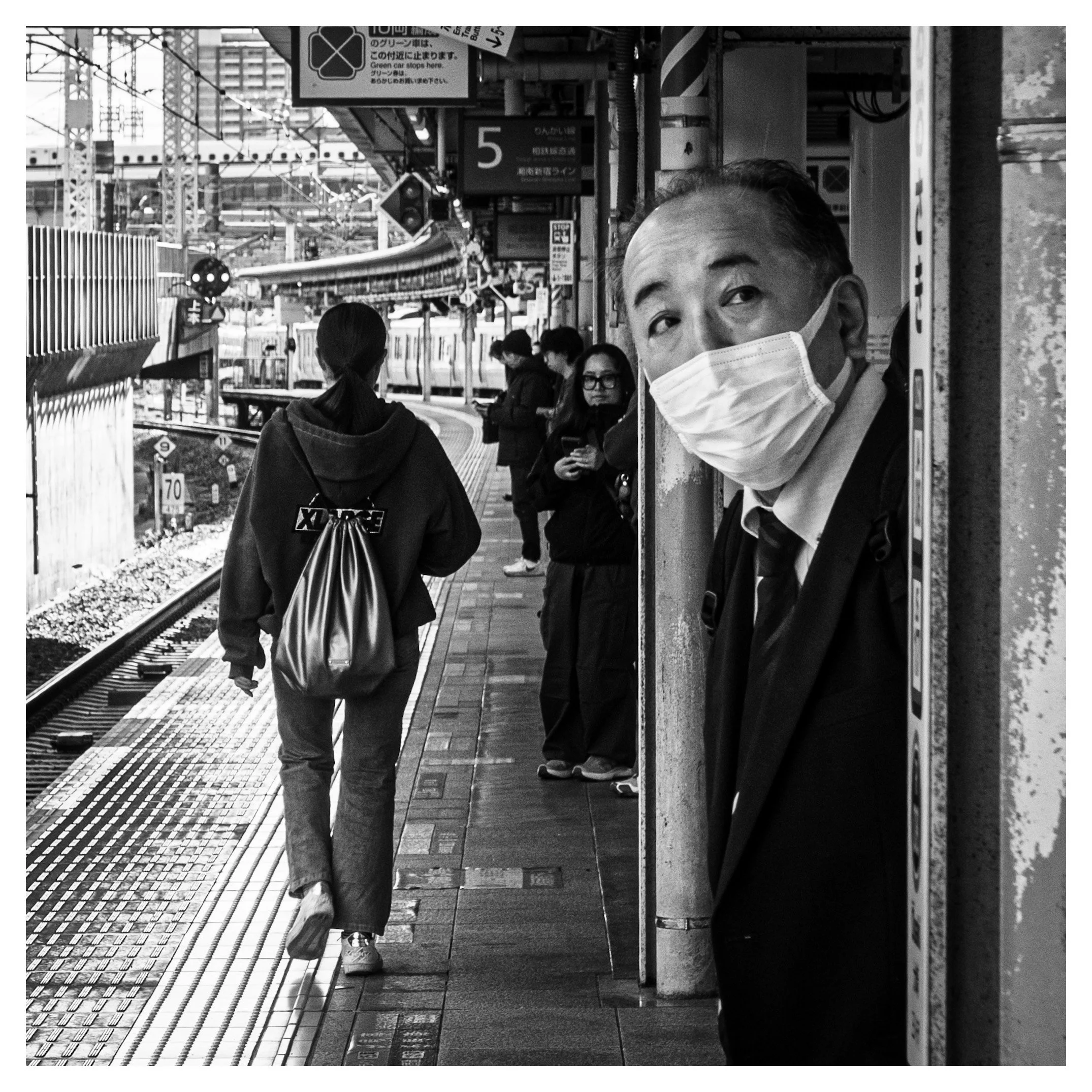* Black and White Processing: The choice of B&W is effective here. It removes the distraction of the likely chaotic colors of the station ads and clothing, unifying the scene. The contrast is punchy—the blacks in the suit are deep, and the whites in the mask are bright without being totally blown out.