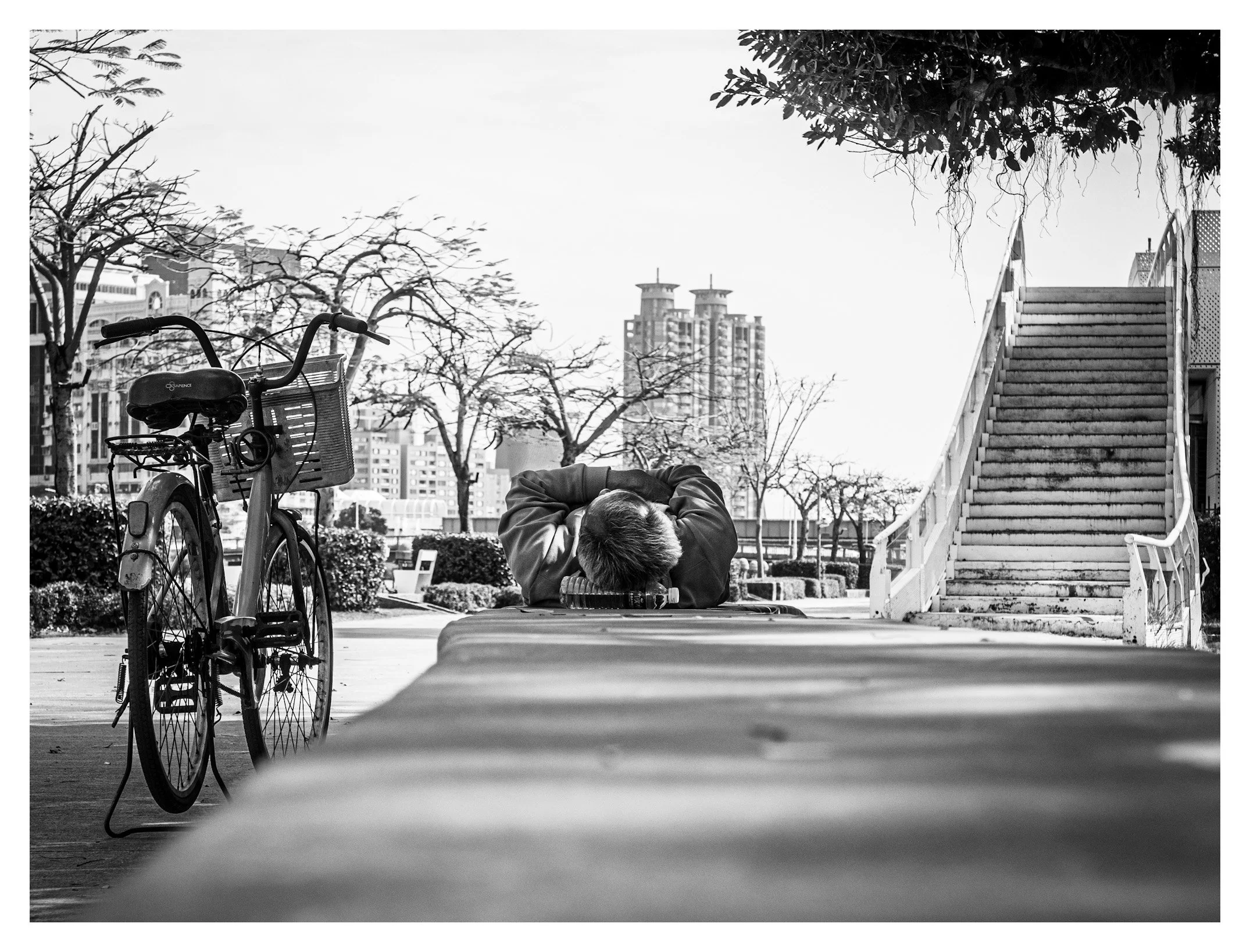 The composition utilizes the rule of thirds effectively, with the bicycle acting as a heavy anchor on the left and the white staircase providing a rhythmic, upward counter-balance on the right. However, the background is quite busy. The modern high-rise in the center-distance competes for attention with the subject's head. While it provides a "Taiwanese" context, its placement is somewhat distracting to the central focal point.