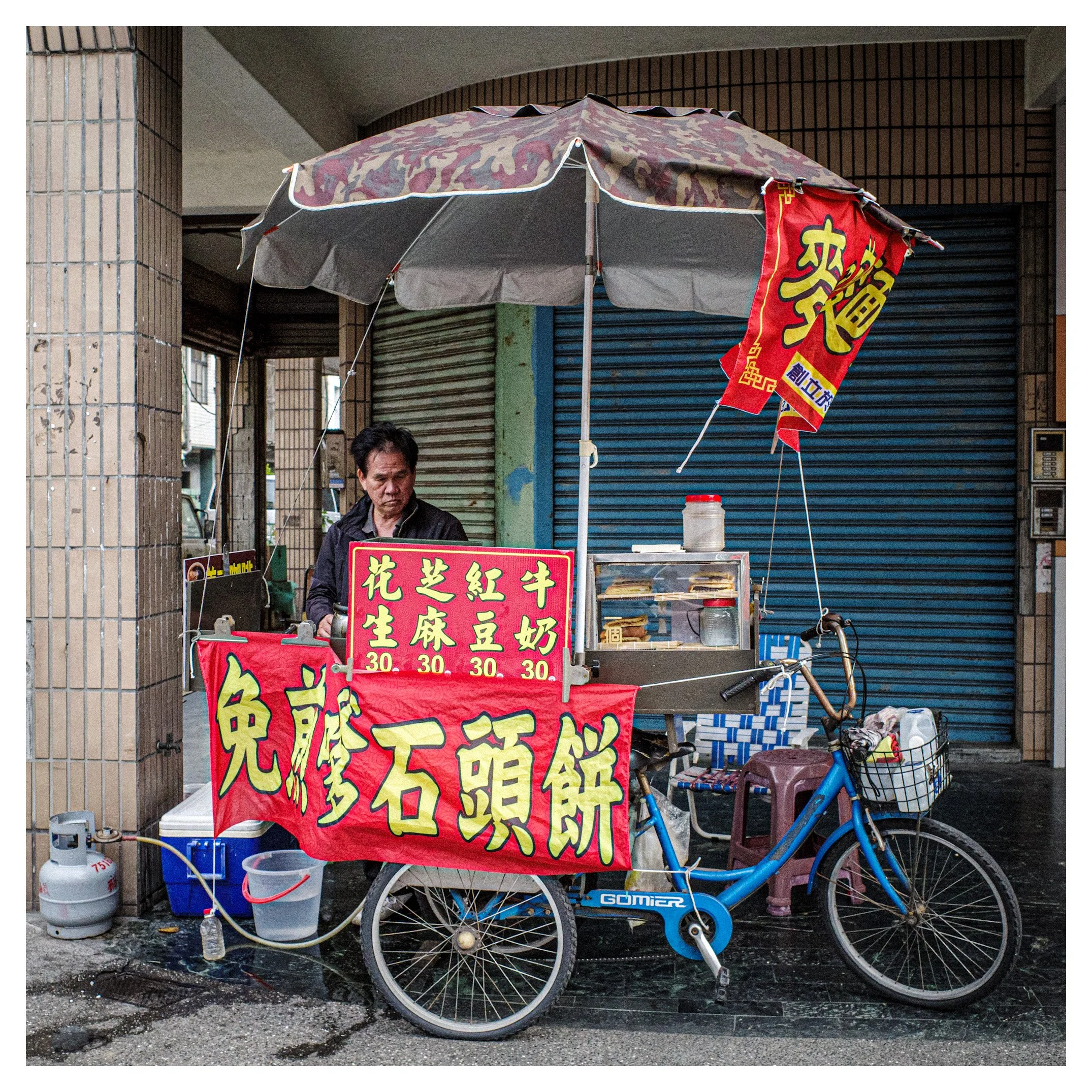 This image captures a quintessentially Taiwanese scene—a traditional "Stone Cake" (石頭餅) vendor and his mobile workstation. There is a wonderful tactile quality here; the weathered tiles of the pillar, the industrial rhythm of the blue rolling shutter, and the vibrant, almost defiant red of the vendor's signage.