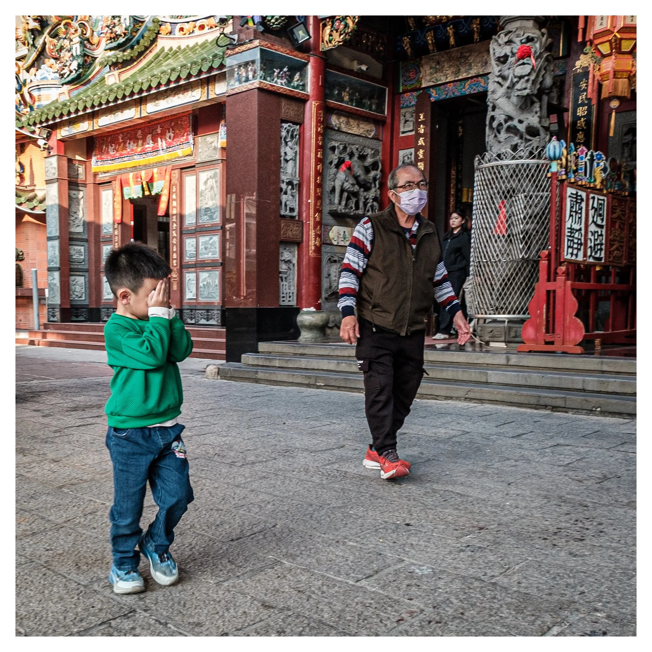 Street photography in Taiwan offers a unique blend of ancient tradition and rapid modern movement. In this analysis of a candid moment at the Shi Luo Dan temple in Tainan, we explore how spatial tension and color theory can transform a simple observation into a compelling narrative of generational contrast.