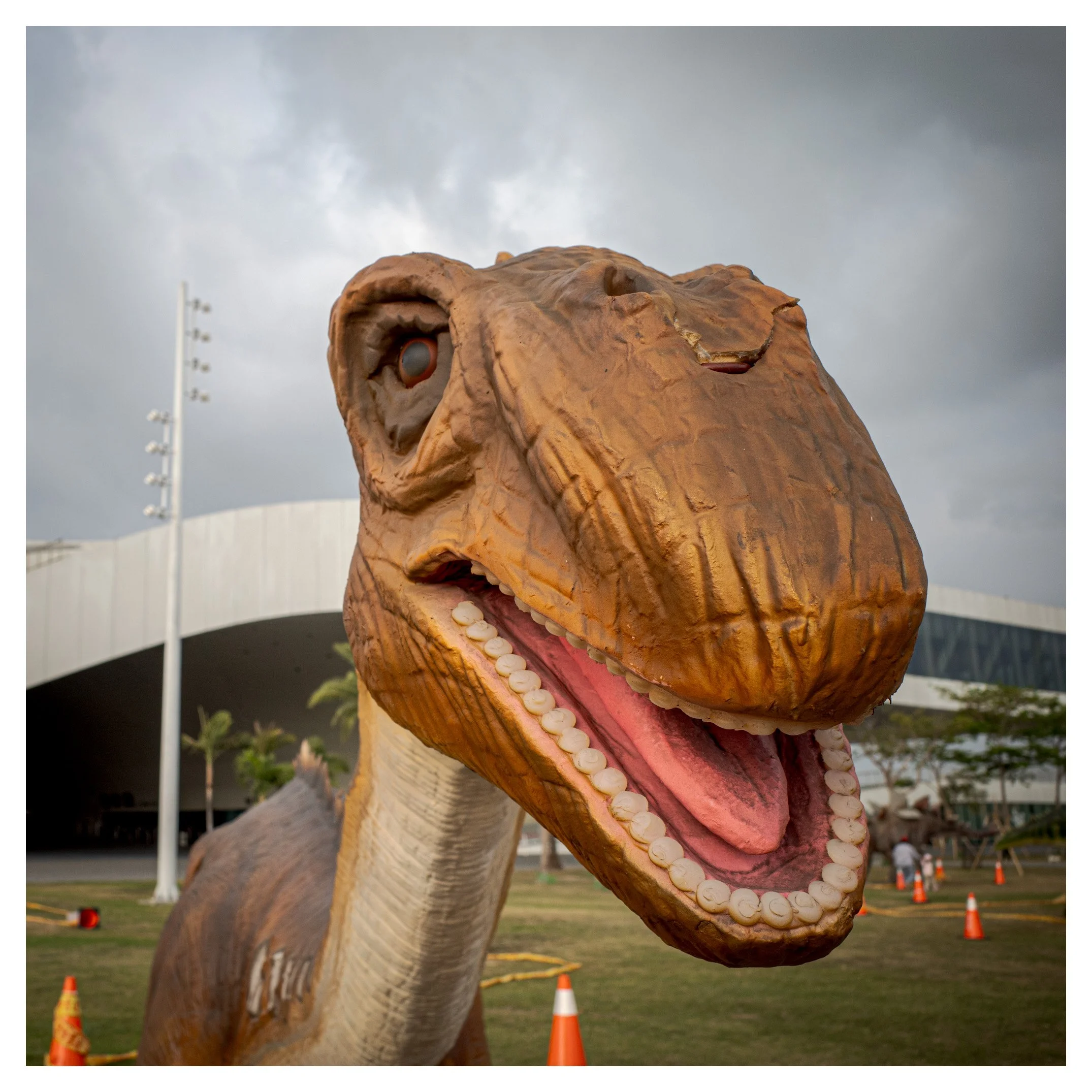 To improve this specific composition, I would suggest a more intentional management of the background elements. While the orange traffic cones provide a color pop that mirrors the dinosaur's eye, their scattered placement feels accidental rather than curated. Moving slightly to the left or right could have aligned the sleek, white curve of the building more harmoniously with the dinosaur’s neck, creating a stronger visual "flow" between the subject and its environment. Additionally, wait for a moment where the sky offers either more dramatic light or a cleaner backdrop to prevent the dinosaur's head from merging with the gray tones of the clouds.