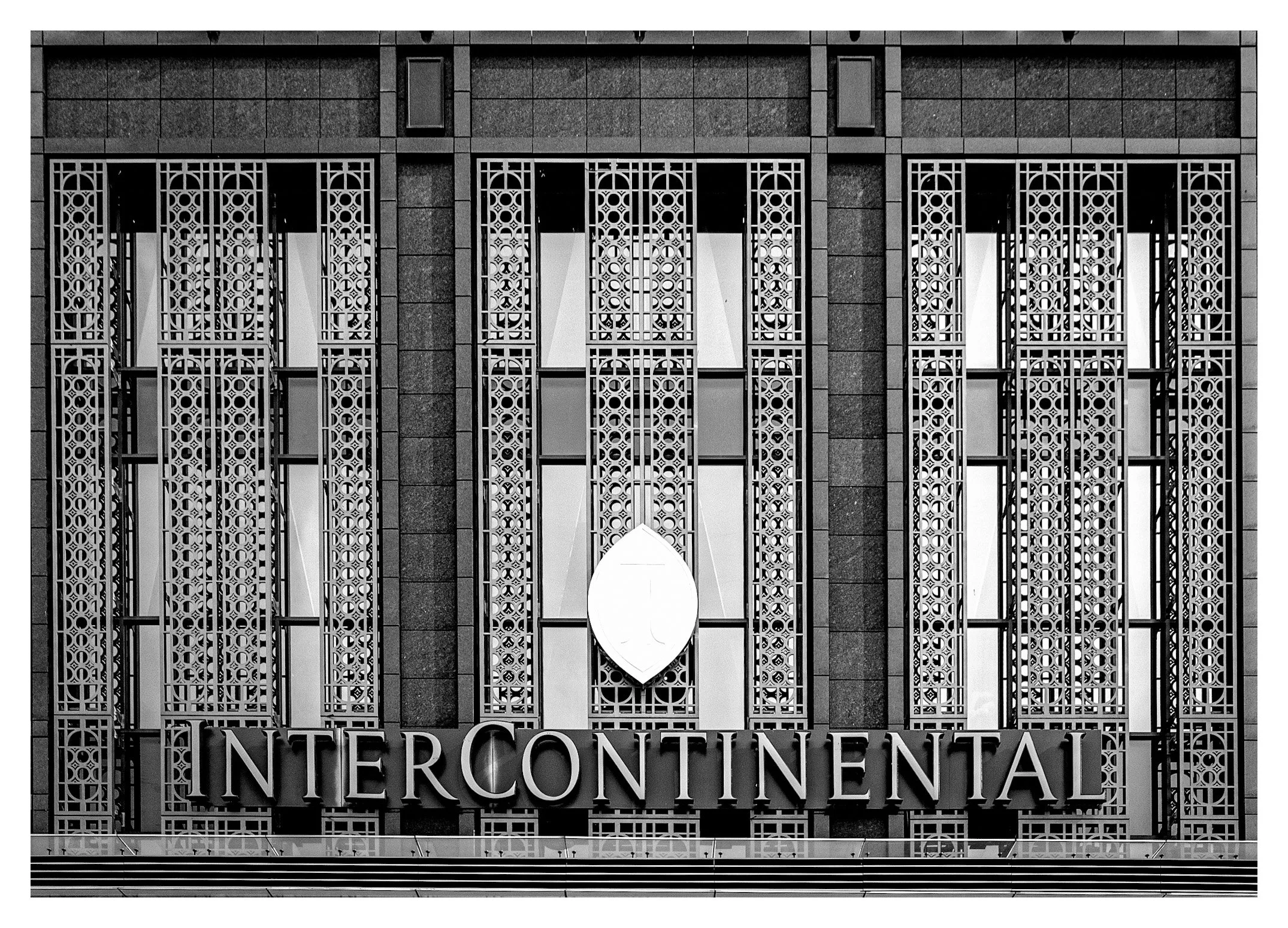 The use of f8 was a masterful choice here. It ensures that the intricate lattice work and the bold "INTERCONTINENTAL" typography remain on the same focal plane, creating a flattened, almost graphic design quality rather than a standard three-dimensional architectural shot. The verticality is imposing, and the centered logo acts as a necessary anchor in a sea of repetitive geometry.