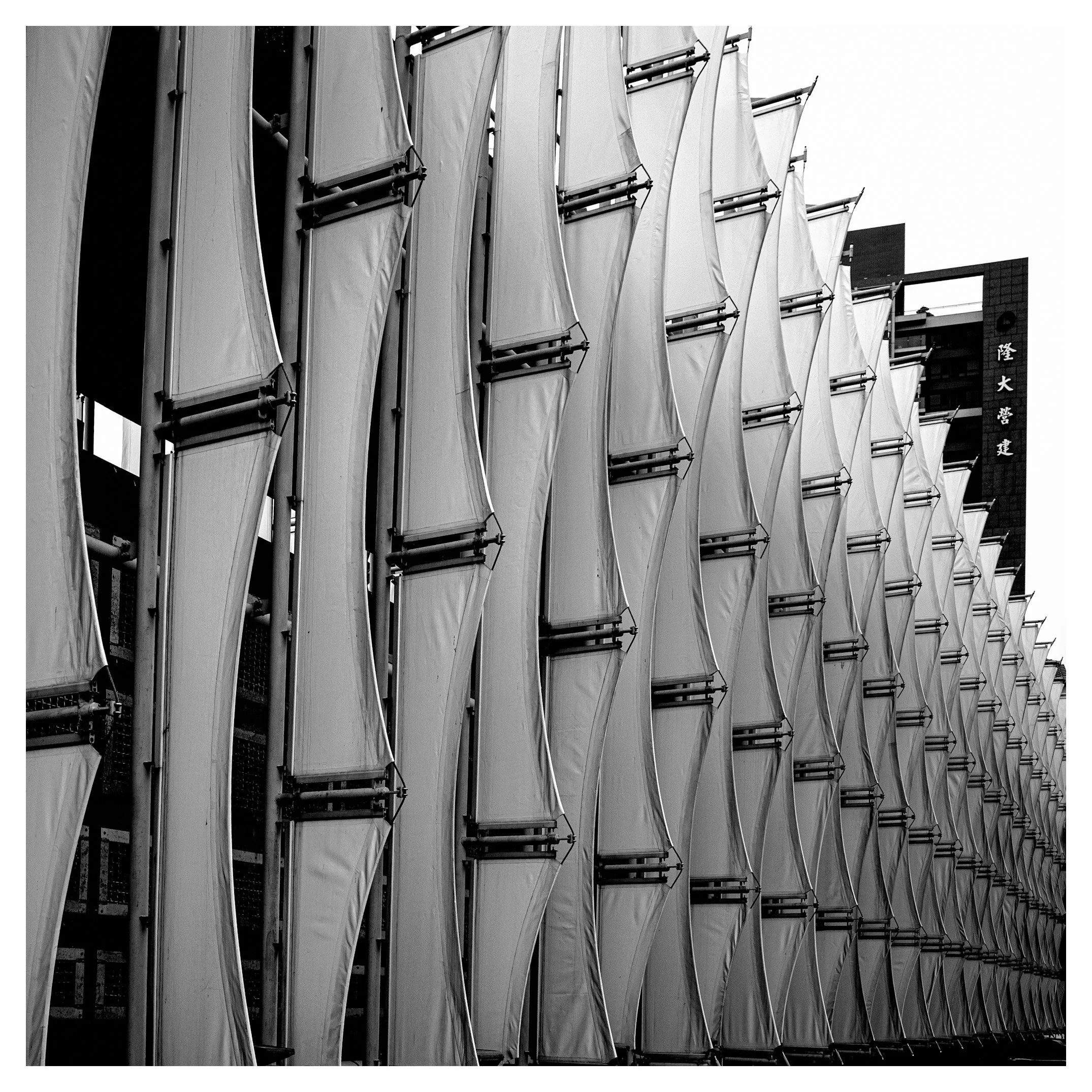 The choice of high-contrast black and white is particularly effective here. By removing the local color of the canvas and the steel, you force the viewer to focus on the interplay of light, shadow, and geometric repetition. The inclusion of the vertical sign on the right provides a literal anchor to the location, but it also creates a fascinating tension between the repetitive abstraction of the sails and the concrete reality of urban construction.