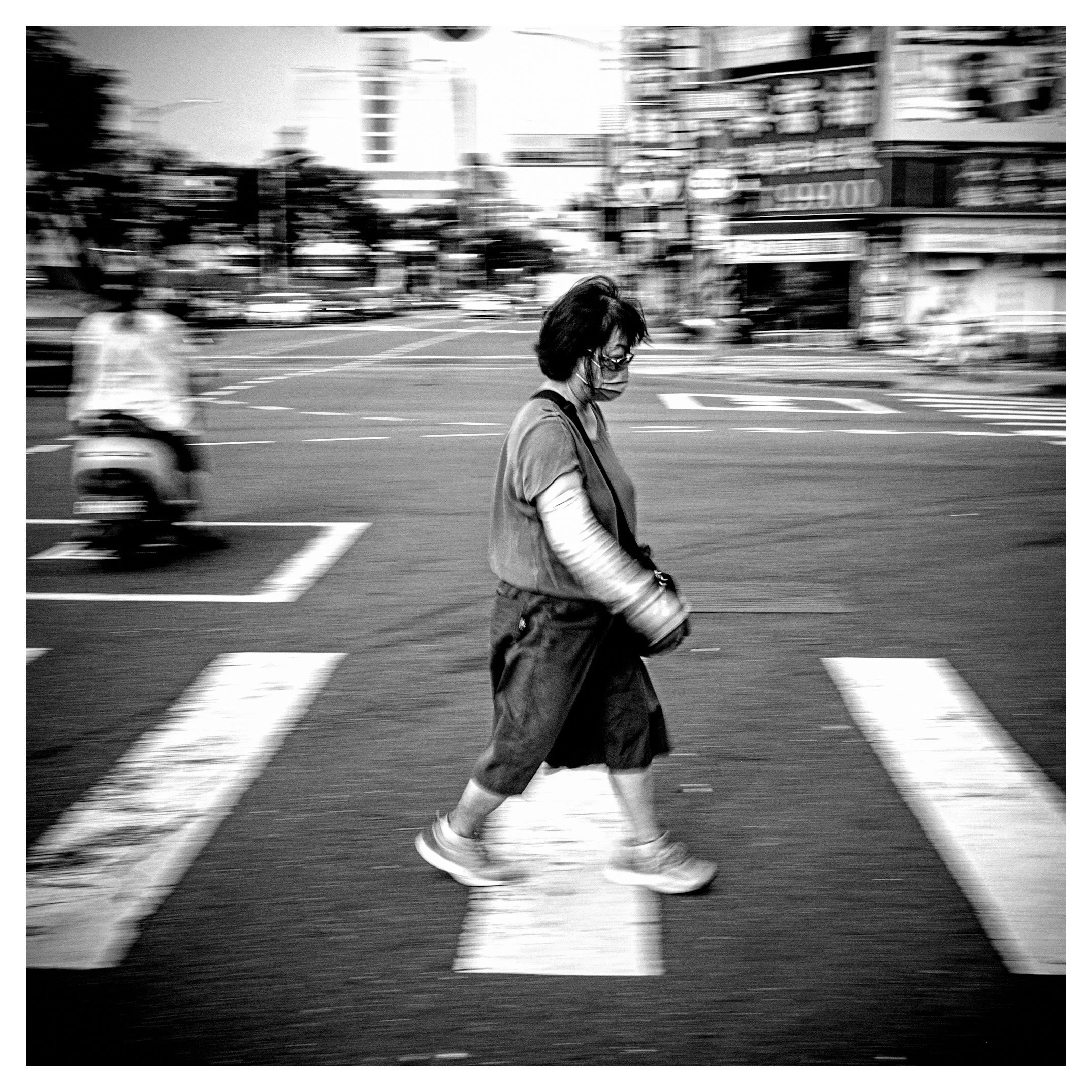 Your image is a visceral slice of urban life that prioritizes mood and movement over clinical sharpness. By choosing a slow shutter speed of 1/10, you have transformed the subject into a spectral figure, a "ghost" navigating the high-contrast geometry of the crosswalk. This approach echoes the Provoke era of Japanese photography—specifically the are-bure-pake (grainy, blurry, out-of-focus) aesthetic that rejected traditional "good" photography in favor of raw emotion.