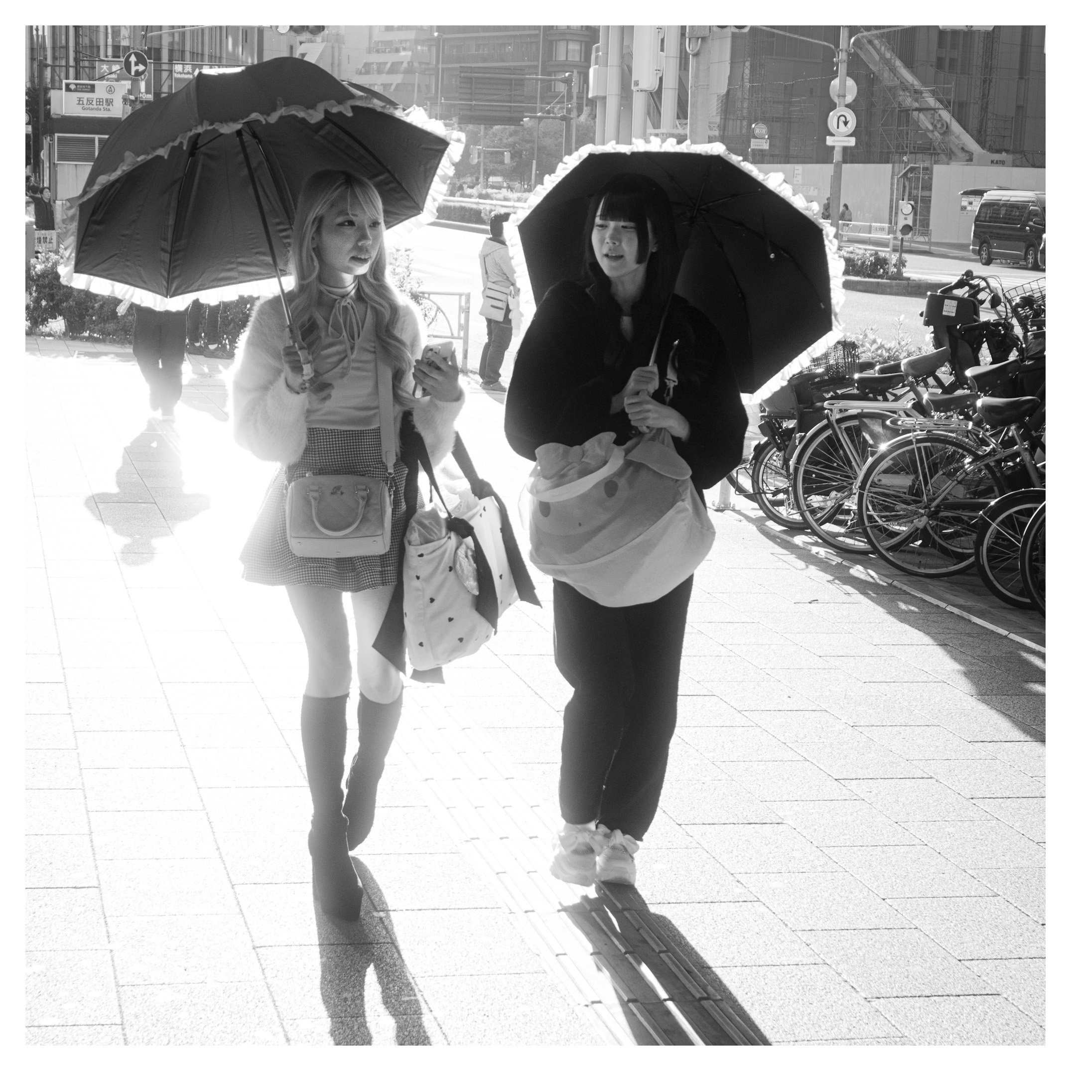 Shot on my Leica in Gotanda, this image captures two figures with umbrellas, backlit by bright sunlight. The high contrast between the dark figures and the bright background creates that signature Fan Ho aesthetic. The umbrellas become graphic shapes, the figures become silhouettes with just enough detail to suggest life and movement.