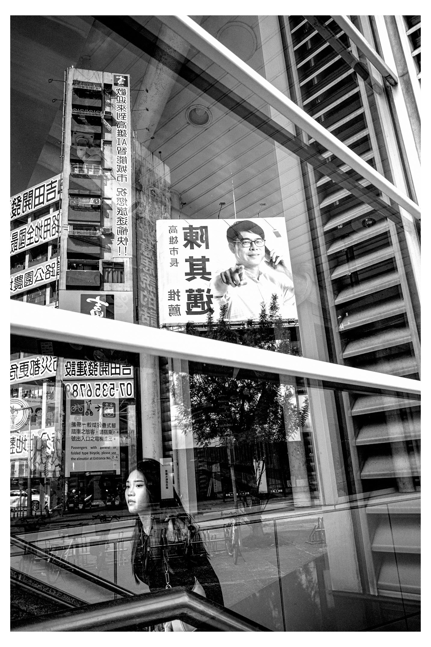 The strength of this photograph lies in its juxtaposition. The political billboard, featuring a man pointing authoritatively, looms over the young woman's face. Her expression is passive and introspective, creating a narrative tension between the "loud" public sphere and the "quiet" private moment. The high-contrast black and white editing reinforces the gritty, street-photography aesthetic, reminiscent of the Japanese Provoke era.