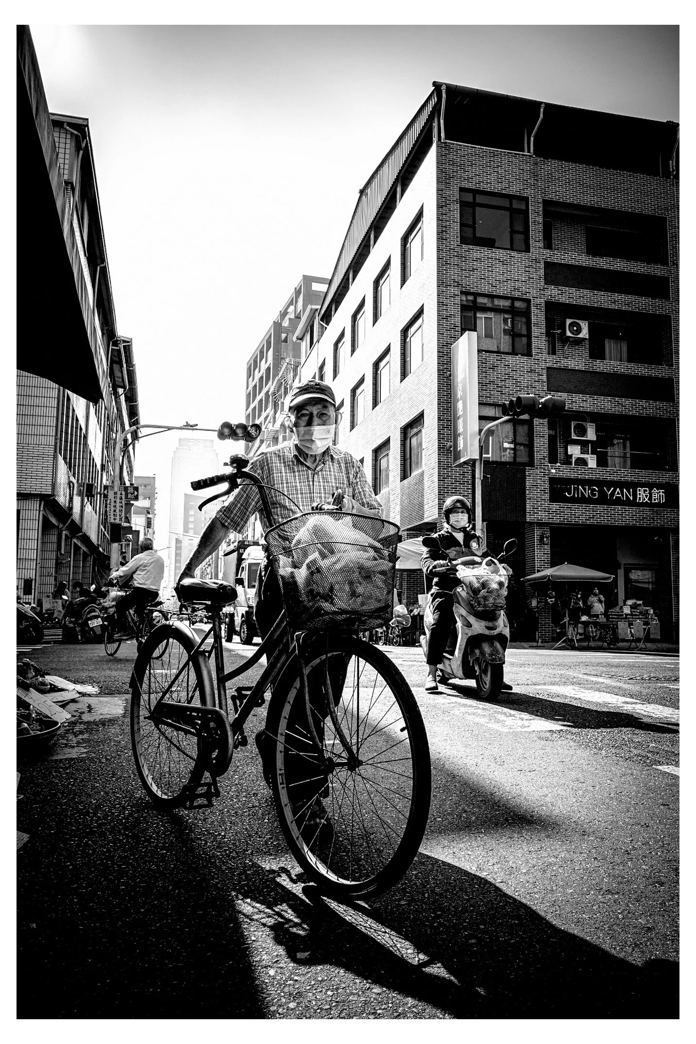 Your image captures a quintessential moment of Taiwanese life—the intersection of tradition and modernity through the lens of a mask-wearing elder on a bicycle. The high-contrast black and white treatment immediately draws the eye to the textures of the brickwork and the strong leading lines of the architecture.