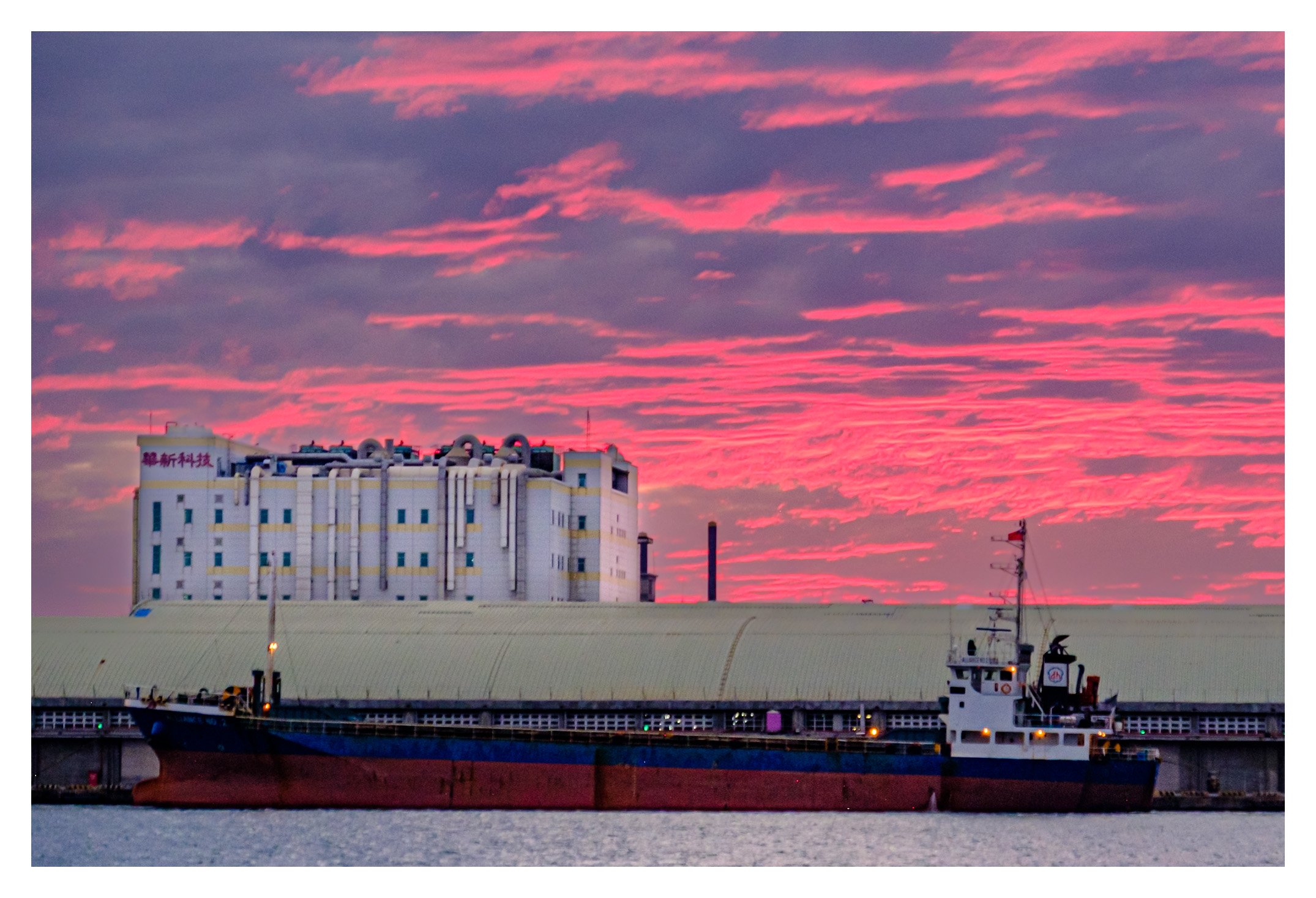 The composition is grounded by the horizontal weight of the ship and the warehouse, which provide a stable stage for the dramatic sky. However, the image feels slightly crowded. The top of the white industrial building is very close to the upper edge of the magenta clouds, which creates a bit of "visual tension" where we want breathing room.