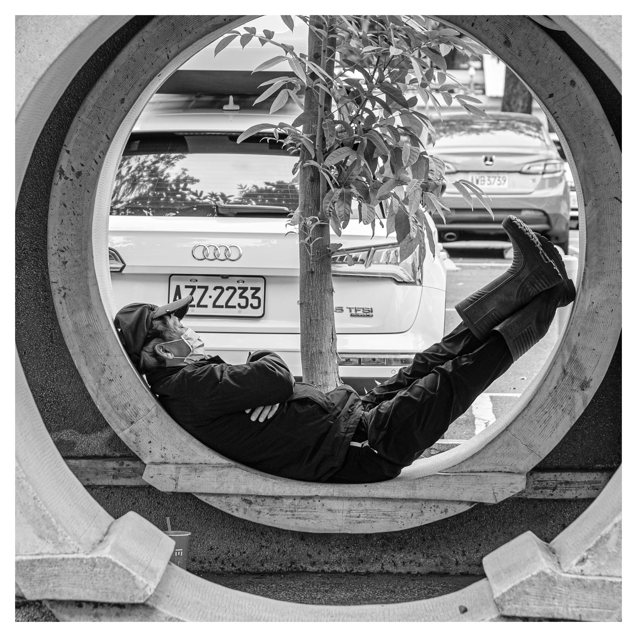 There is a wonderful, almost surreal dichotomy at play here. You have captured a moment of vulnerability—a man resting—encased within the brutalist rigidity of a concrete cylinder. This "frame within a frame" is a classic compositional device that immediately isolates your subject from the noise of the city, turning the pipe into a temporary sanctuary, or perhaps a modern, urban womb. The vertical line of the tree trunk bisecting the circle is a bold choice; it visually anchors the image but also disrupts the flow of the sleeper’s curved form.