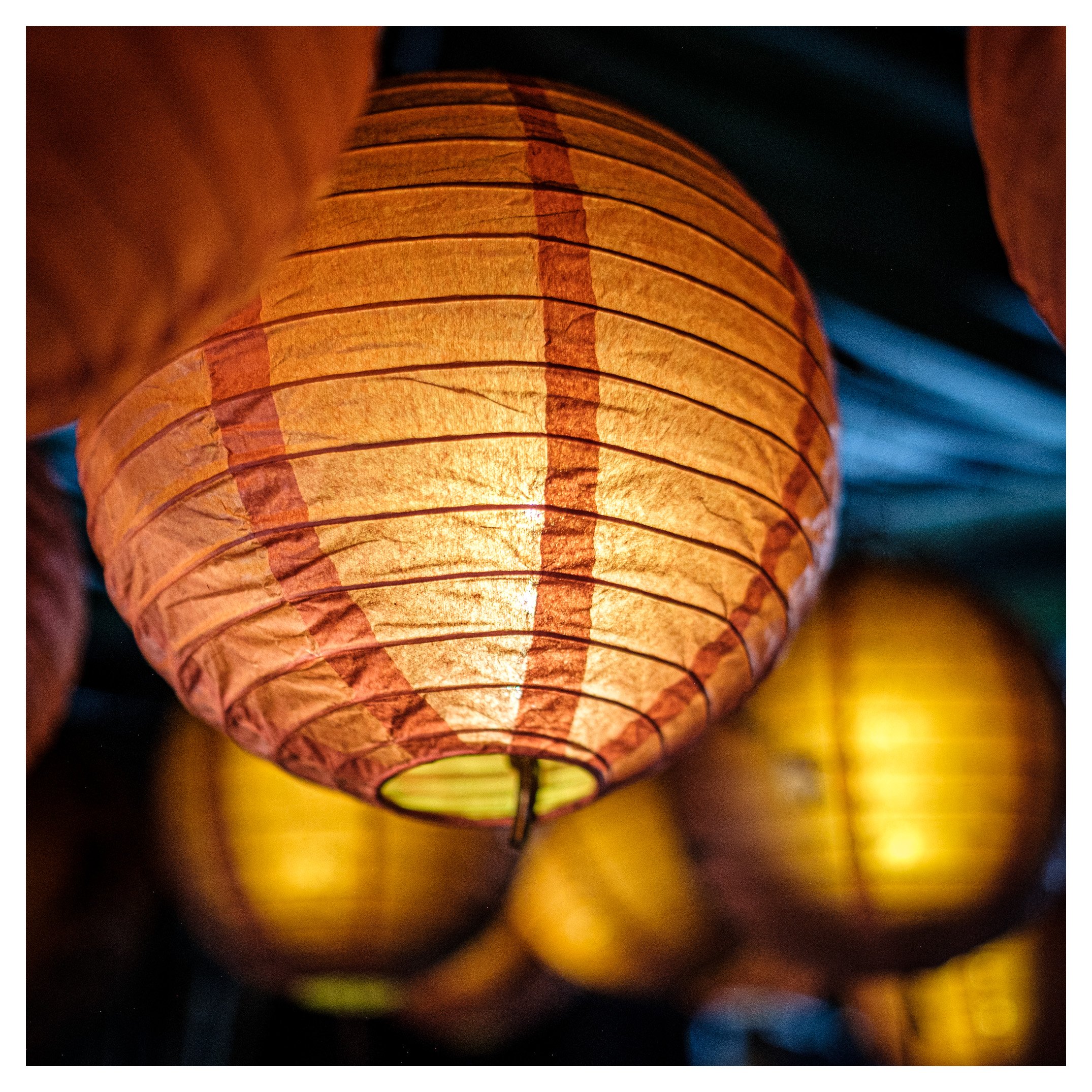 The image presents a study in warmth and intimacy. The primary subject—a paper lantern—glows with a visceral, amber luminescence that immediately warms the viewer. The choice of the Fujifilm X-Pro2 is telling; its sensor renders color with a nostalgic filmic quality that suits this subject perfectly.