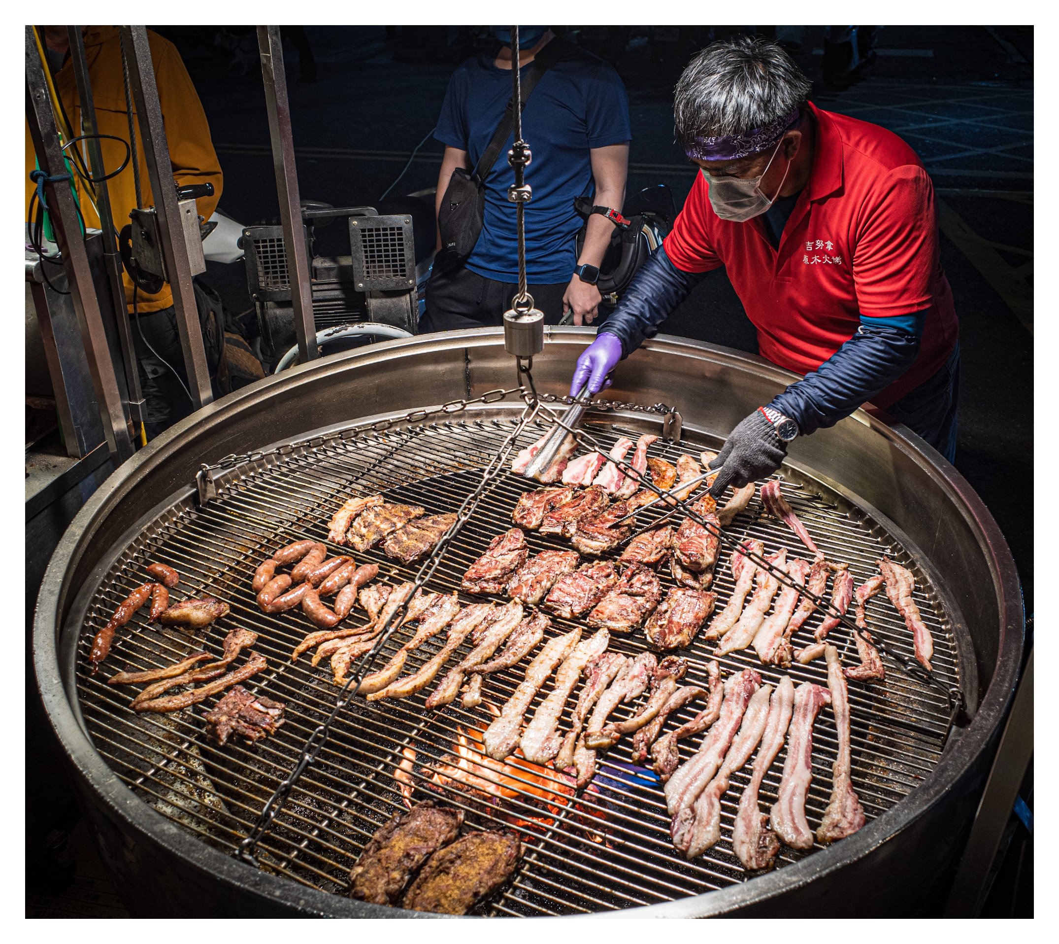 There is a satisfying, almost hypnotic gravity to this image. You have anchored the frame on the geometry of the grill—a literal circle of heat that organizes the chaos of the Kaohsiung night market into a coherent stage. The choice of the Ricoh GRIII, a 28mm equivalent, forces you into the fray, and the perspective here feels intimate, hovering just over the shoulder of the action.