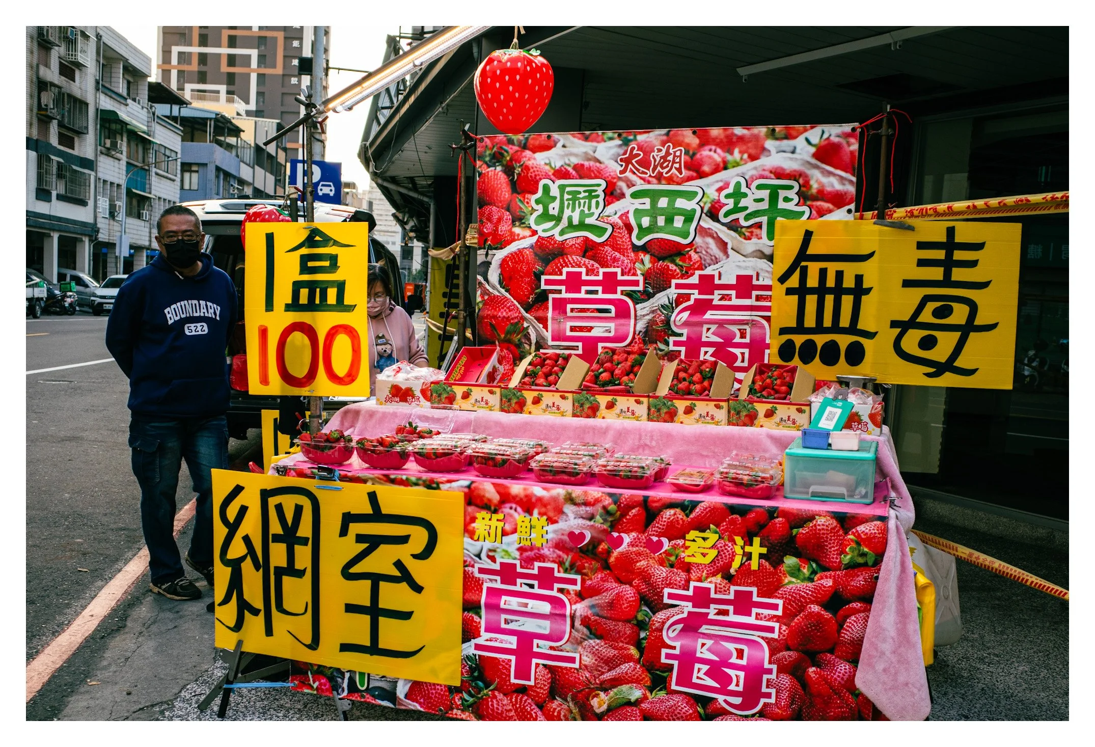 My dear photographer, let us be frank. This image breathes "fatigue." It is a competent record of a scene—the vivid reds of the "Da Hu Strawberries" signage, the yellow price cards, the vendor in his blue hoodie—but it stops there. You have captured the noun of the market (the stall) but missed the verb (the interaction, the moment).